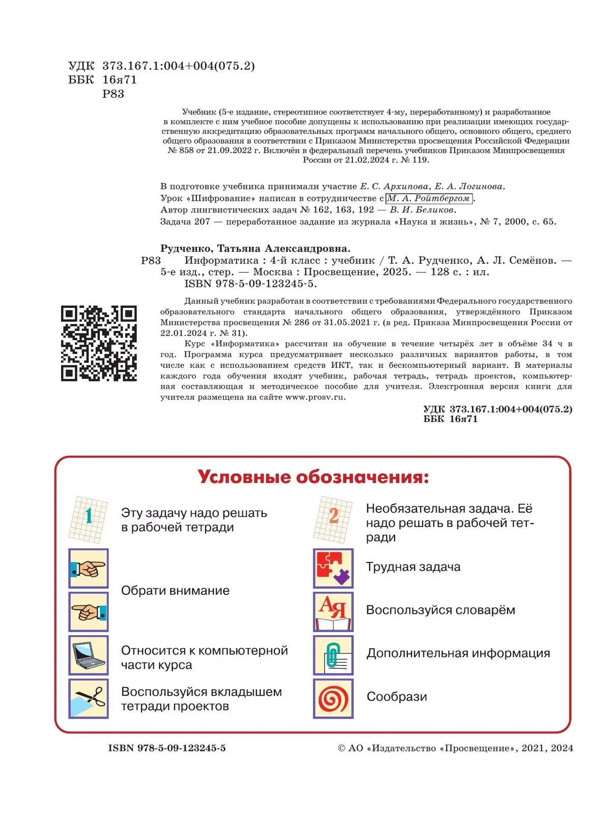 Данный учебник разработан в соответствии с требованиями Федерального государственного образовательного стандарта начального общего образования, утверждённого Приказом Министерства просвещения № 286 от 31.05.2021 г. Курс «Информатика» рассчитан на обучение в течение четырёх лет в объёме 34 ч в год. Программа курса предусматривает несколько различных вариантов работы, в том числе как с использованием средств ИКТ, так и бескомпьютерный вариант.