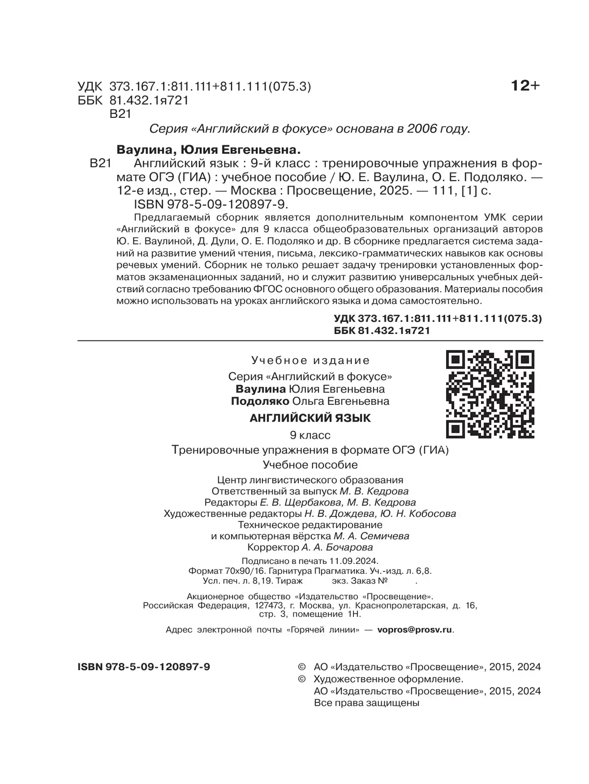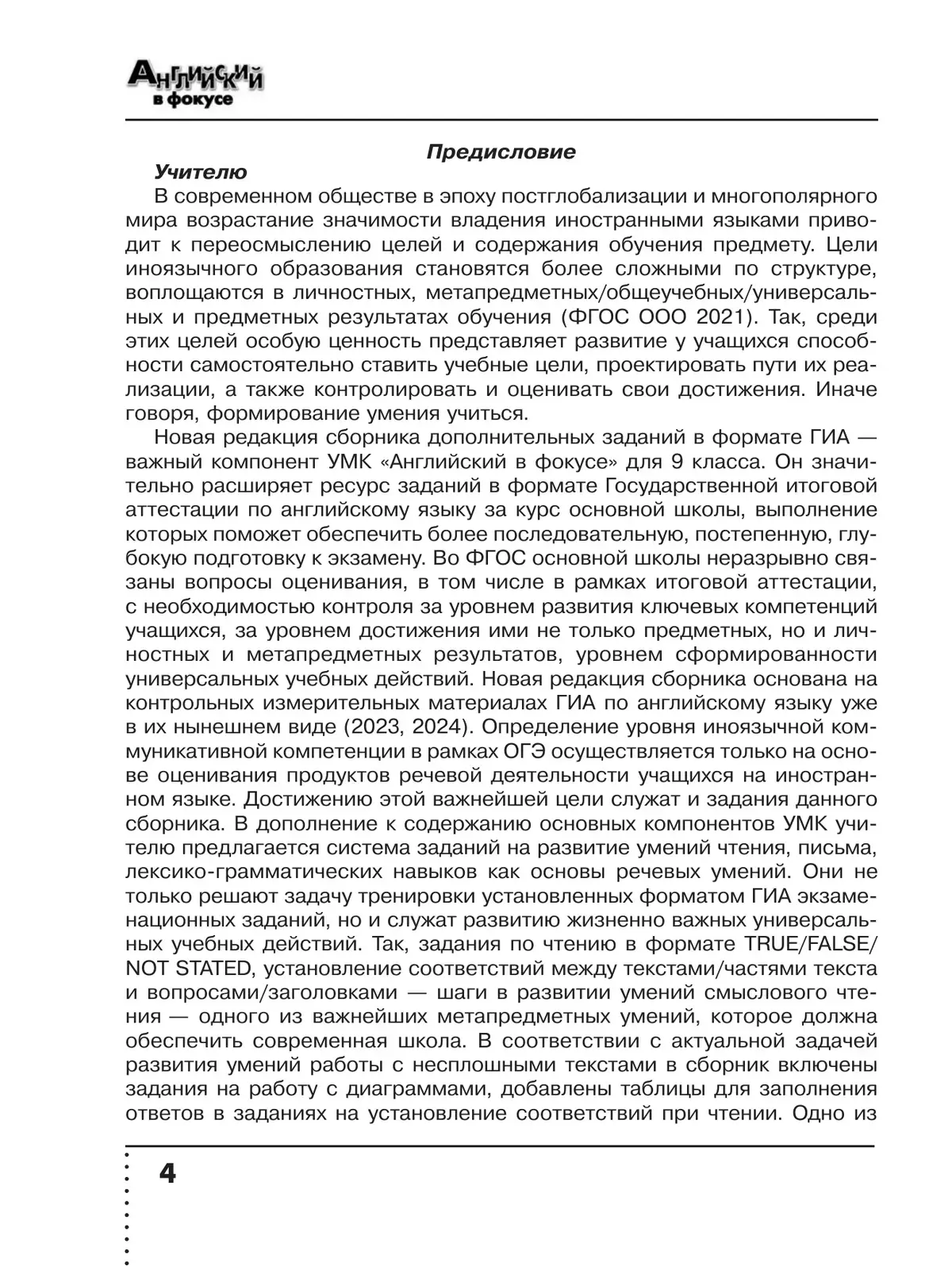 Предлагаемый сборник является дополнительным компонентом УМК серии «Английский в фокусе» для 9 класса общеобразовательных организаций авторов Ю. Е. Ваулиной, Д. Дули, О. Е. Подоляко и др. В сборнике предлагается система заданий на развитие умений чтения, письма, лексико-грамматических навыков как основы речевых умений. Сборник не только решает задачу тренировки установленных форматов экзаменационных заданий, но и служит развитию универсальных учебных действий согласно требованию ФГОС основного общего образования. Материалы пособия можно использовать на уроках английского языка и дома самостоятельно.