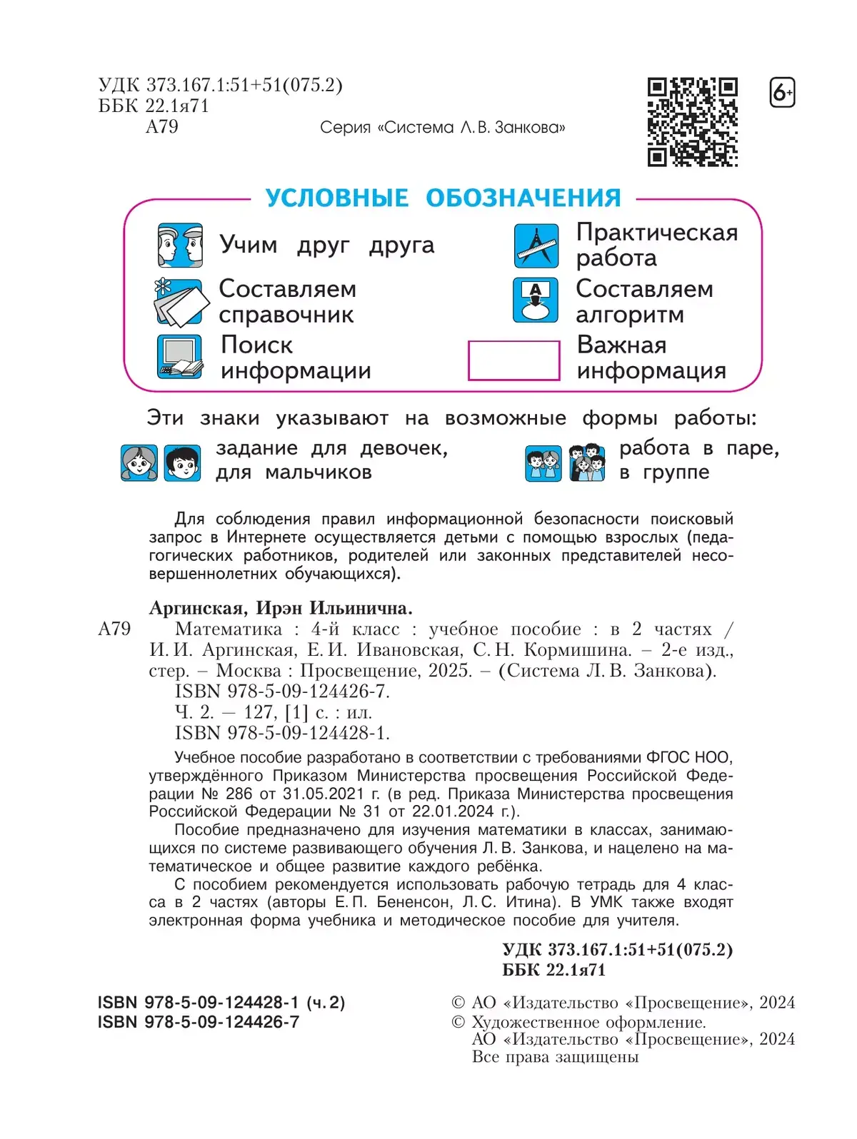 Учебное пособие подготовлено в соответствии с требованиями ФГОС НОО, утверждённого приказом Министерства просвещения Российской Федерации № 286 от 31.05.2021 г. Пособие предназначено для изучения математики в классах, занимающихся по системе развивающего обучения Л. В. Занкова, и нацелено на математическое и общее развитие каждого ребёнка. С пособием рекомендуется использовать рабочую тетрадь для 4 класса в 2 частях (авторы Е. П. Бененсон, Л. C. Итина). В УМК также входят электронная форма учебника и методическое пособие для учителя.