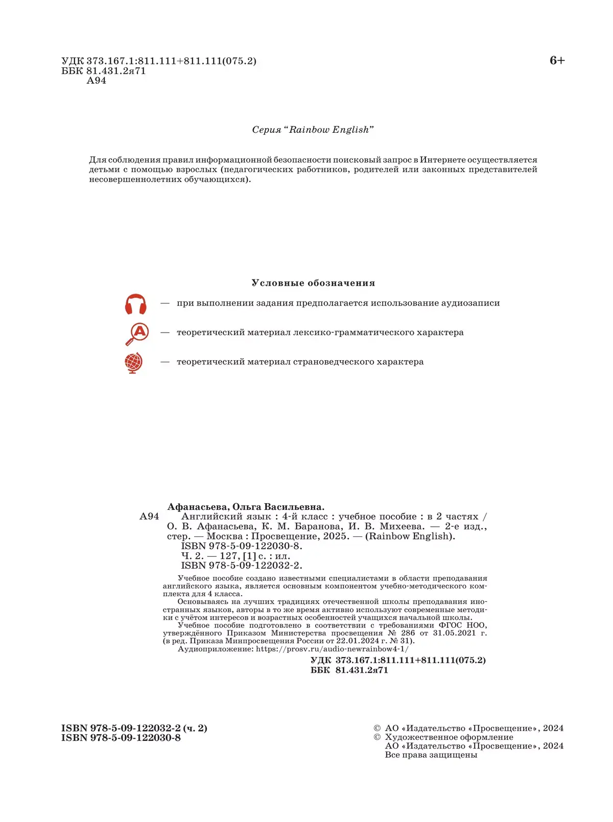 Учебное пособие создано известными специалистами в области преподавания английского языка, является основным компонентом учебно-методического комплекта для 4 класса. Основываясь на лучших традициях отечественной школы преподавания иностранных языков, авторы в то же время активно используют современные методики с учётом интересов и возрастных особенностей учащихся начальной школы. Учебное пособие подготовлено в соответствии с требованиями ФГОС НОО, утверждённого Приказом Министерства просвещения № 286 от 31.05.2021 г.