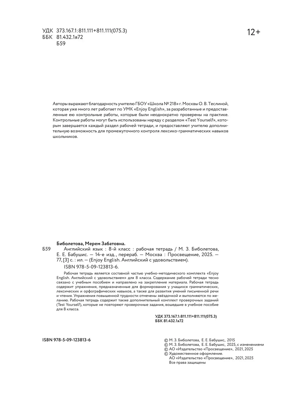 Рабочая тетрадь является составной частью учебно-методического комплекта «Enjoy English. Английский с удовольствием» для 8 класса. Содержание рабочей тетради тесно связано с учебным пособием и направлено на закрепление материала, изучаемого на уроках. Рабочая тетрадь содержит упражнения, предназначенные для формирования у учащихся грамматических, лексических и орфографических навыков, а также для развития умений письменной речи и чтения. Упражнения повышенной трудности отмечены звездочкой и выполняются по желанию. Рабочая тетрадь содержит также дополнительный комплект проверочных заданий (Test Yourself), которые не повторяют проверочные задания, вошедшие в учебное пособие 8 класса.