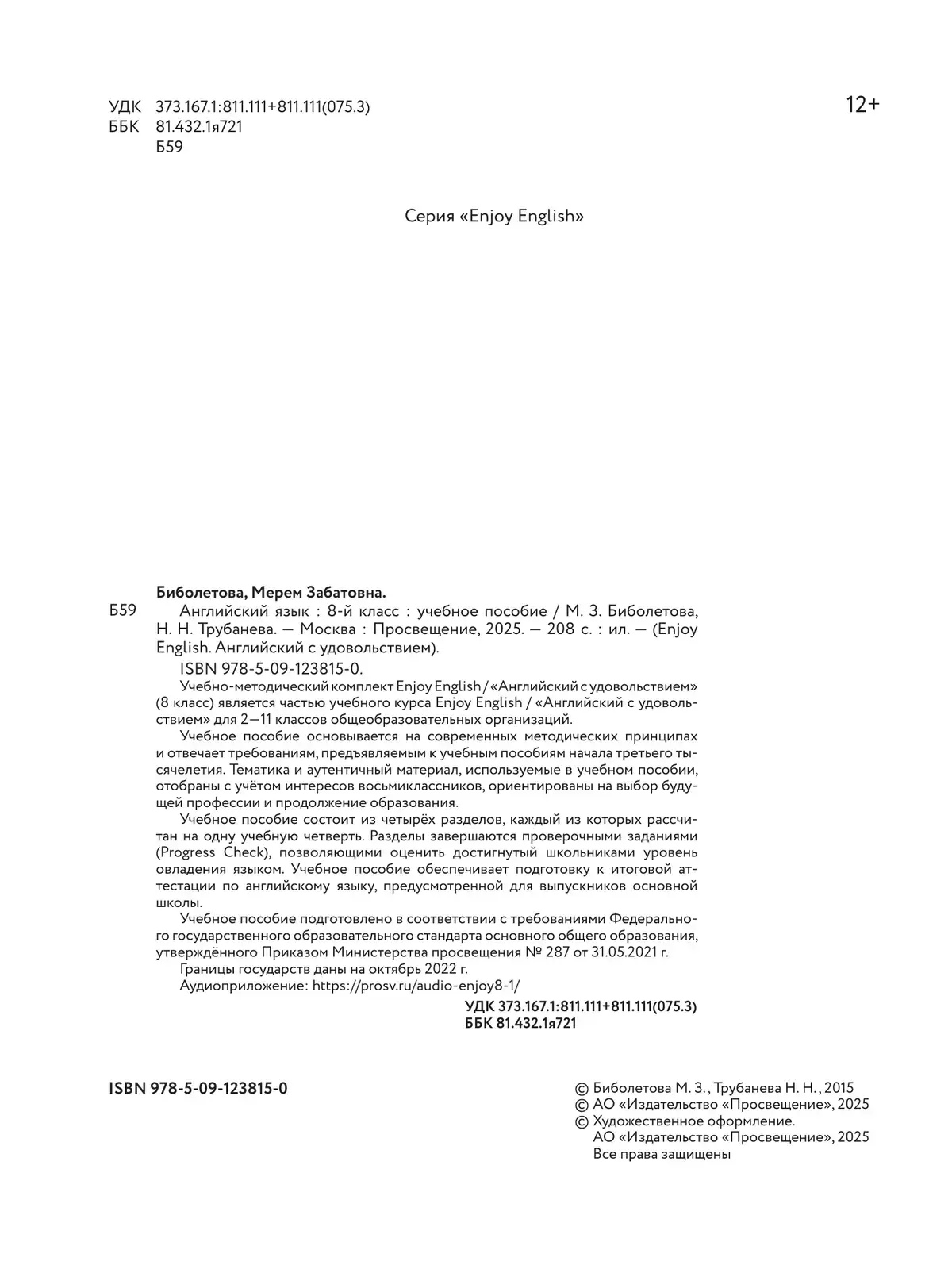 Учебно-методический комплект «Enjoy English. Английский с удовольствием» (8 класс) является частью учебного курса «Enjoy English. Английский с удовольствием» для 2—11 классов общеобразовательных организаций. Тематика и аутентичный материал, используемые в учебном пособии, отобраны с учётом интересов и возрастных особенностей восьмиклассников. Учебное пособие состоит из четырёх разделов, каждый из которых рассчитан на одну учебную четверть. Разделы завершаются заданиями для самопроверки (Progress Check), позволяющими учащимся оценить достигнутый ими уровень овладения языком. Учебное пособие разработано в соответствии со всеми требованиями Федерального государственного образовательного стандарта основного общего образования, утверждённого Приказом Министерства просвещения № 287 от 31.05.2021 г.