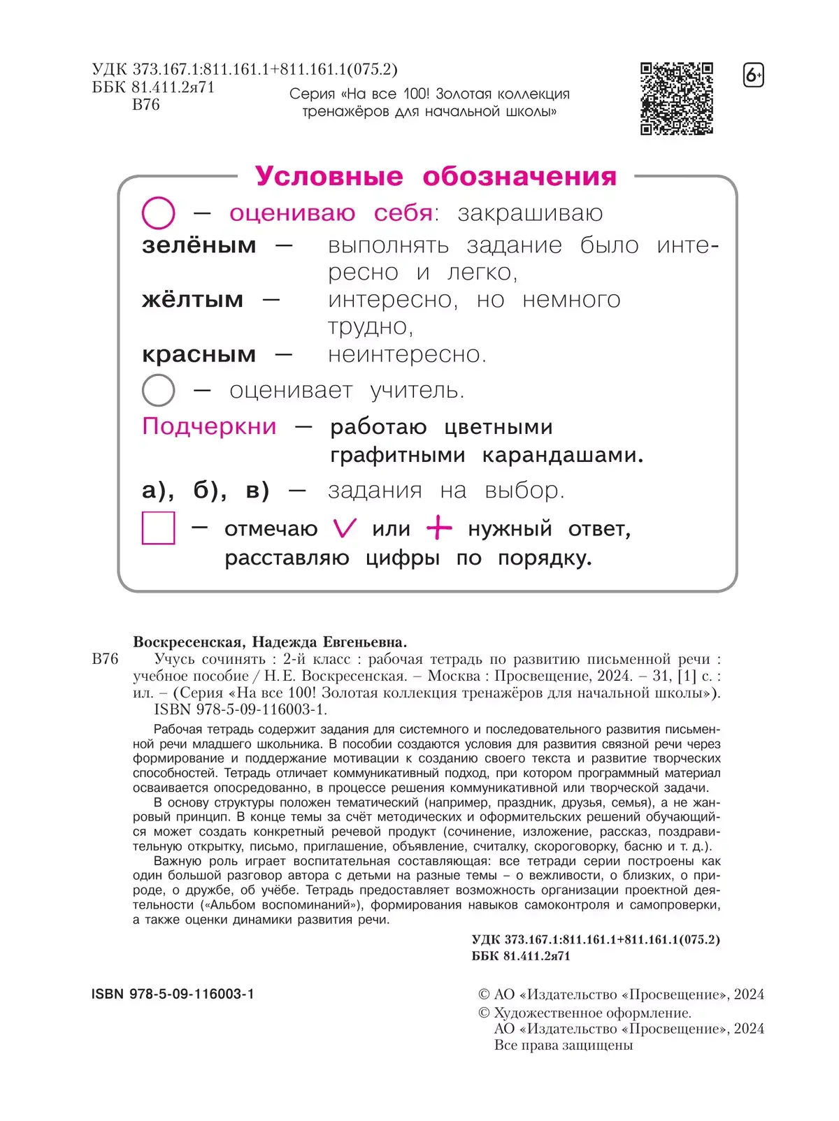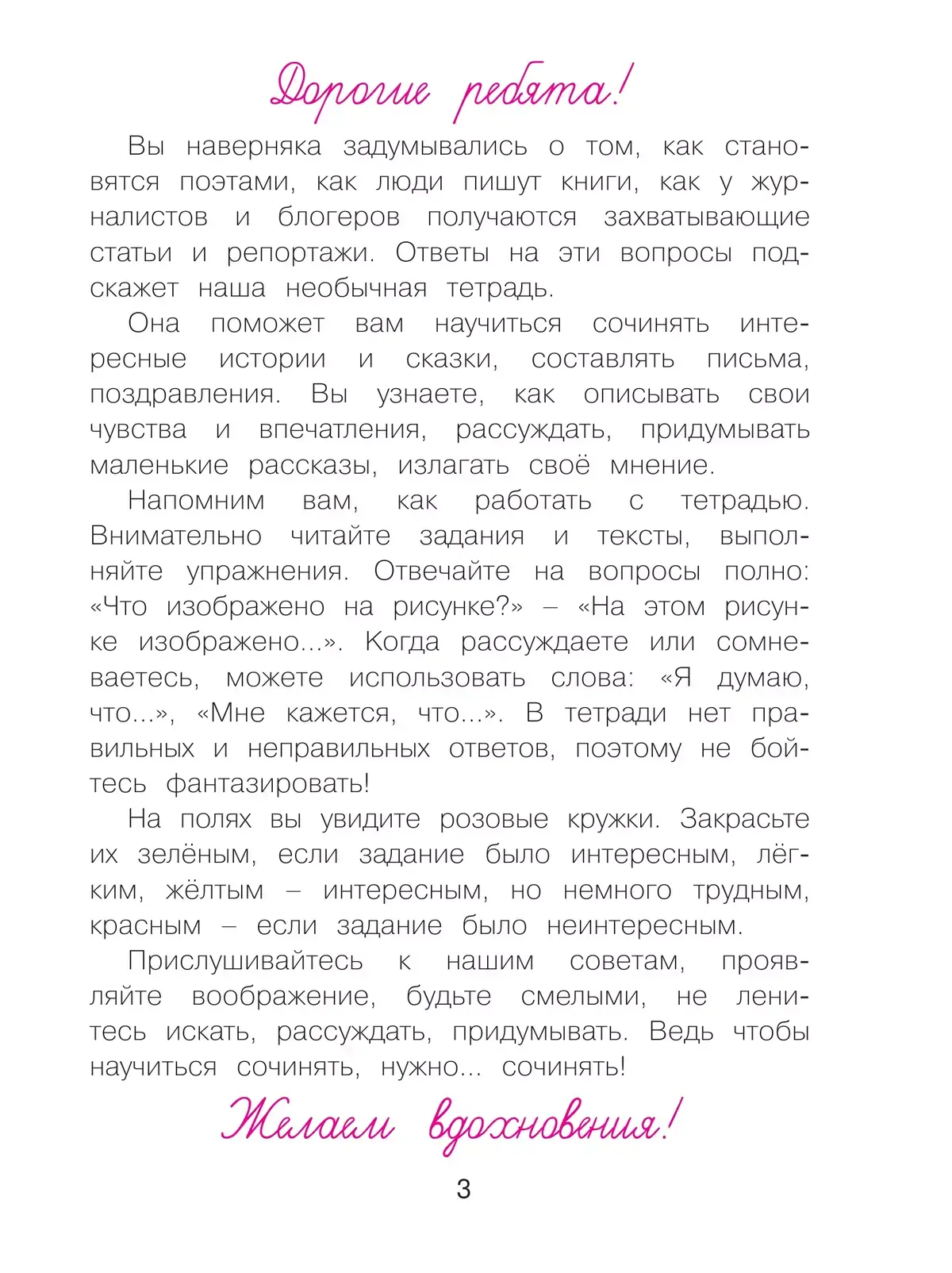Рабочие тетради «Учусь сочинять» для 1-4 классов нацелены на формирование связной речи младших школьников: учат понимать слова, предложения, связи между ними, смысл текста, законы его построения, передавать содержание текста и составлять свой собственный. Задания пособий способствуют повышению уровня читательской грамотности, развитию воображения и творческой самореализации обучающихся. Тетрадь позволяет ребёнку легко и с увлечением обогащать свою речь, знакомиться с функциональными стилями, с типами текста и простыми жанрами. Материал пособия имеет воспитательный потенциал. Тетради помогают оценить уровень развития речи ребёнка, увидеть динамику этого развития, результативность обучения и выявить возможные причины трудностей в освоении связной речи, сформировать навыки самоконтроля и самопроверки.