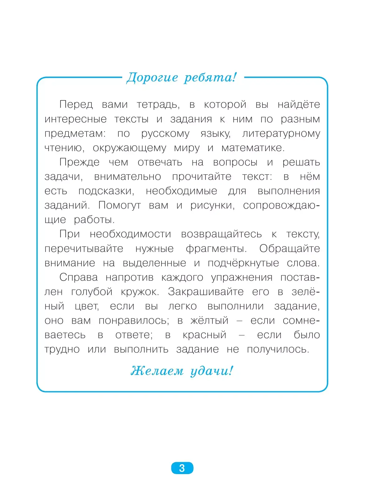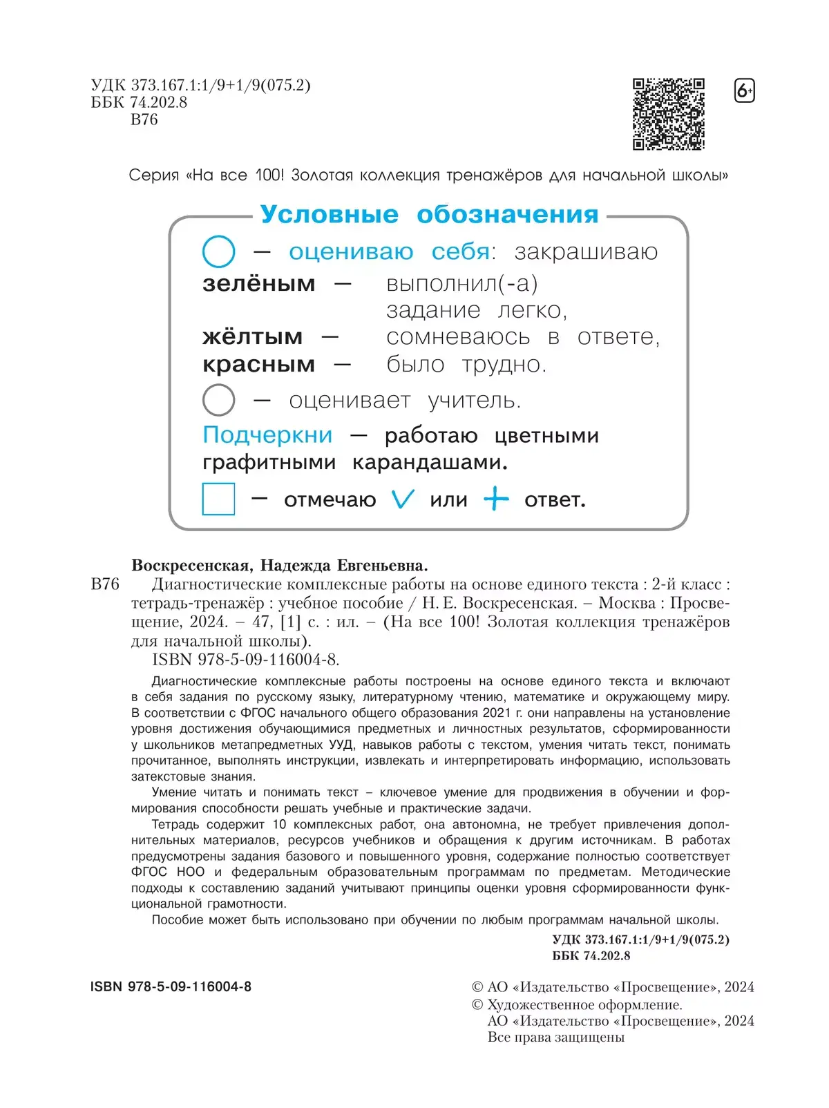 Диагностические комплексные работы построены на основе единого текста и включают в себя задания по русскому языку, литературному чтению, математике и окружающему миру. В соответствии с ФГОС начального общего образования они направлены на установление уровня достижения обучающимися предметных и личностных результатов, сформированности у школьников метапредметных УУД, навыков работы с текстом, умения читать текст, понимать прочитанное, выполнять инструкции, извлекать и интерпретировать информацию, использовать затекстовые знания. Умение читать и понимать текст – ключевое умение для продвижения в обучении и формирования способности решать учебные и практические задачи. Тетрадь содержит 10 комплексных работ, она автономна, не требует привлечения дополнительных материалов, ресурсов учебников и обращения к другим источникам. В работах предусмотрены задания базового и повышенного уровня, содержание полностью соответствует ФГОС начального общего образования 2021 г. Методические подходы к составлению заданий учитывают принципы оценки уровня сформированности функциональной грамотности. Пособие может быть использовано при обучении по любым программам начальной школы.