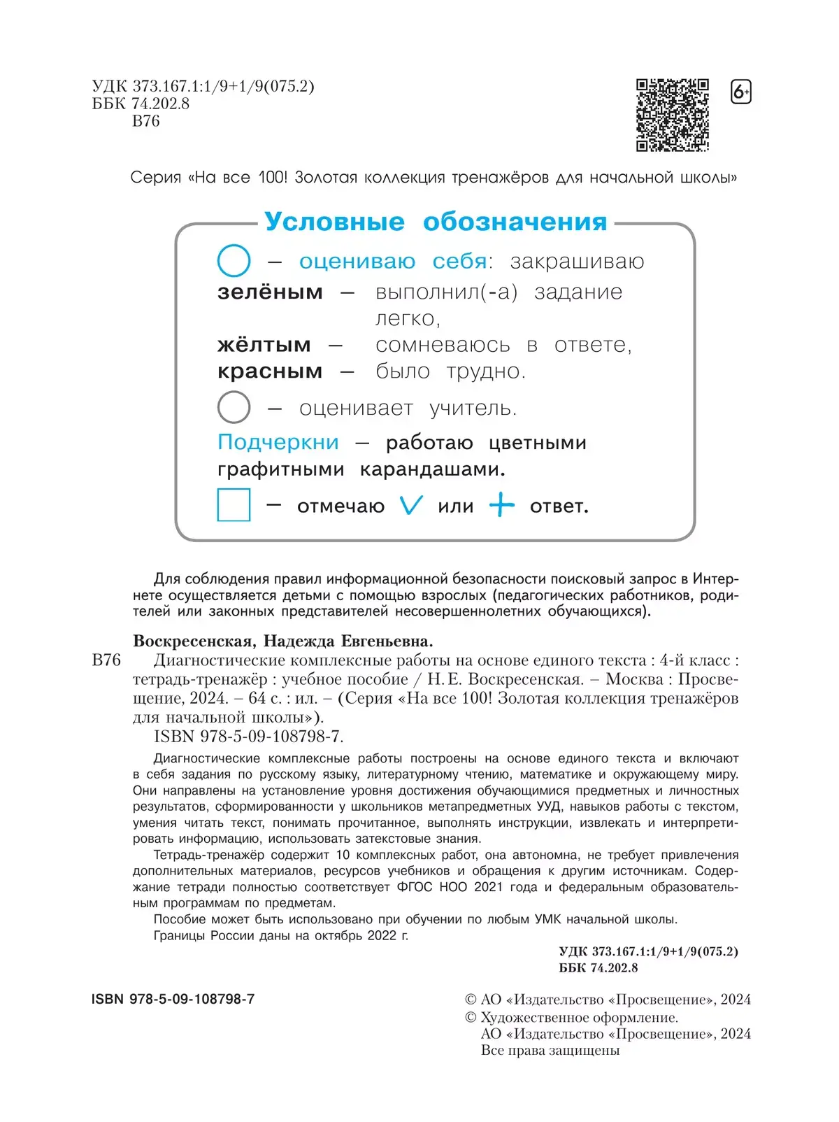 Диагностические комплексные работы построены на основе единого текста и включают в себя задания по русскому языку, литературному чтению, математике и окружающему миру. В соответствии с ФГОС начального общего образования они направлены на установление уровня достижения обучающимися предметных и личностных результатов, сформированности у школьников метапредметных УУД, навыков работы с текстом, умения читать текст, понимать прочитанное, выполнять инструкции, извлекать и интерпретировать информацию, использовать затекстовые знания. Умение читать и понимать текст – ключевое умение для продвижения в обучении и формирования способности решать учебные и практические задачи. Тетрадь содержит 10 комплексных работ, она автономна, не требует привлечения дополнительных материалов, ресурсов учебников и обращения к другим источникам. В работах предусмотрены задания базового и повышенного уровня, содержание полностью соответствует ФГОС начального общего образования 2021 г. Методические подходы к составлению заданий учитывают принципы оценки уровня сформированности функциональной грамотности. Пособие может быть использовано при обучении по любым программам начальной школы.