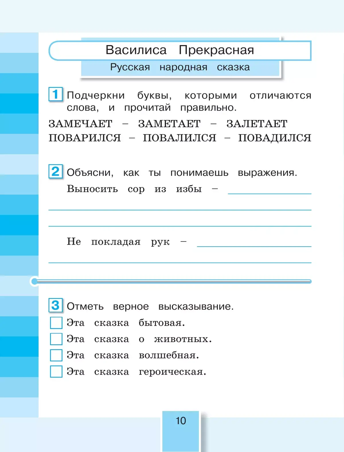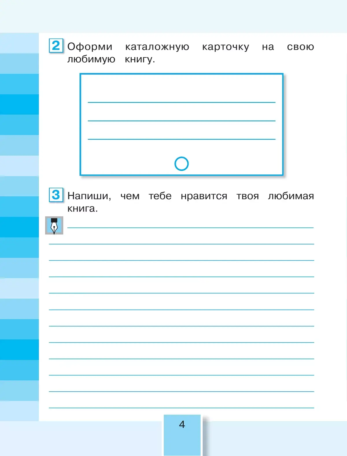 Рабочие тетради содержат дополнительные материалы по каждой теме учебного пособия. В тетрадях дети выполняют задания, требующие практических действий, в процессе которых они совершенствуют свои читательские умения, навыки работы с литературными произведениями, творческие способности.