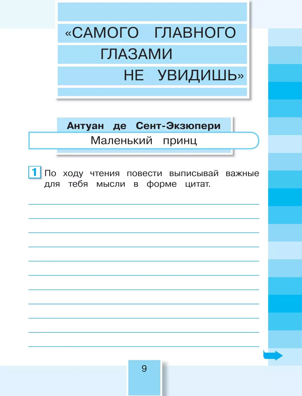 Рабочие тетради содержат дополнительные материалы по каждой теме учебного пособия. В тетрадях дети выполняют задания, требующие практических действий, в процессе которых они совершенствуют свои читательские умения, навыки работы с литературными произведениями, творческие способности.